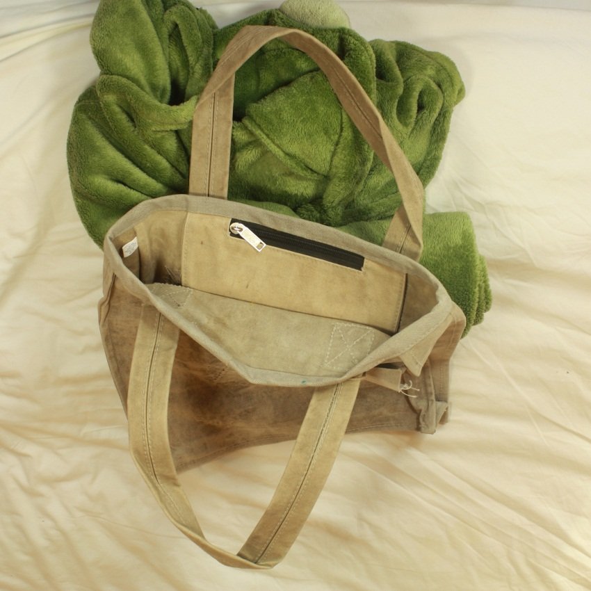 This is one handy upcycled bag! Made from a reclaimed army tent, the open top lends itself to replace your brief case, backpack, or even purse! Great for toting around your important folders, school books, or just your everyday necessities, the 8 inch handles make this easy to carry around town. Reinforced stitching ensures the straps last as long as the rest of the bag- and army tent material is designed to stand up to all sorts of crazy stuff!