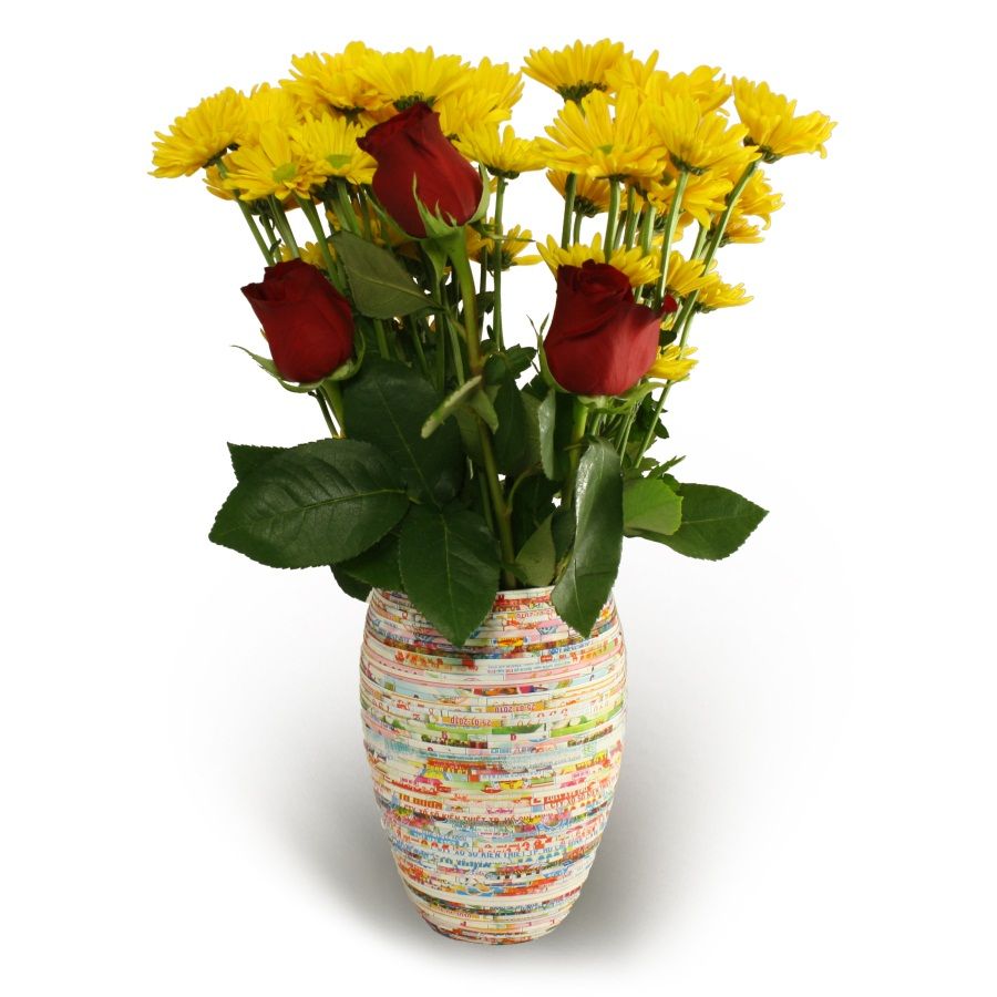 Prettify any room with this lovely vase wrapped in upcycled paper. Every one of these is like a surprise in a box! You never know what color combination you may get, as the paper that is used varies from day to day. Arrange fresh flowers in this vase for a unique still life in any room. Have a breath of spring in your home regardless of the season with one of these vases filled with any color flower arrangement!