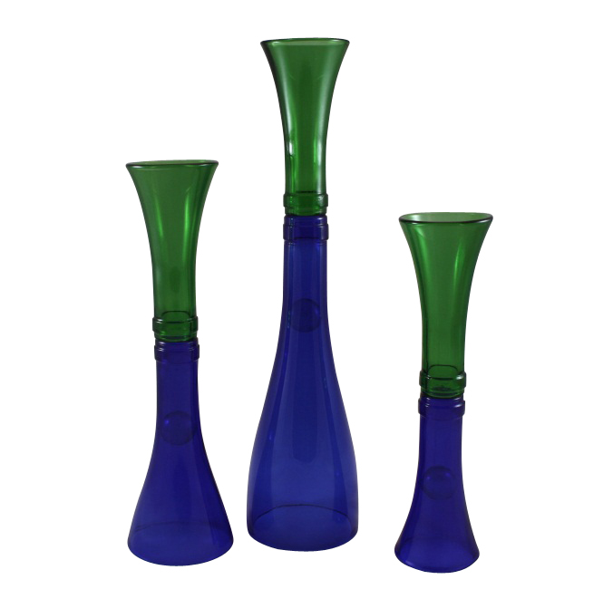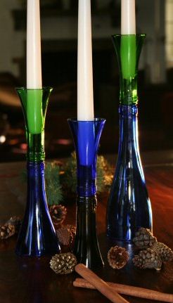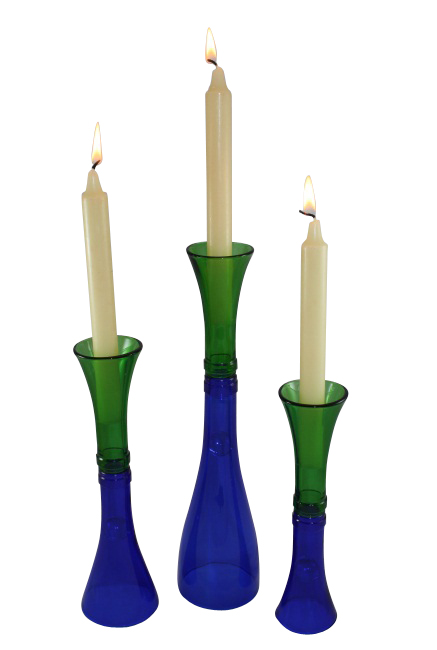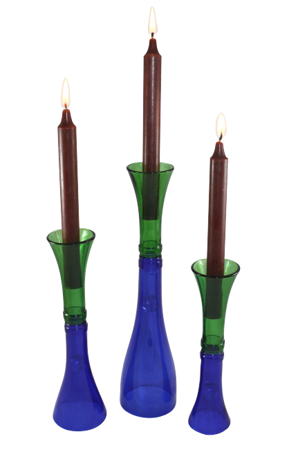 Bring out the "whoa" in your celebrations with this intriguing trio of candle holders. The unique nature of these items allows them to fit into both elegant and casual settings, with the curved shape of the top bottle providing the perfect solution to prevent those annoying wax drips on your table top from lit taper candles.