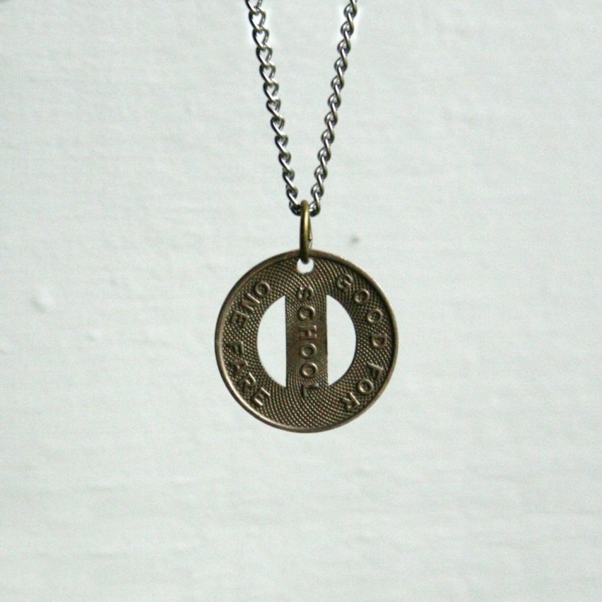 A taste of yesteryear as this vintage lunch token is turned into a unique necklace. We wonder how many times this token was exchanged for a bologna sandwich and a half pint of milk. If only it could talk, the stories it could tell.