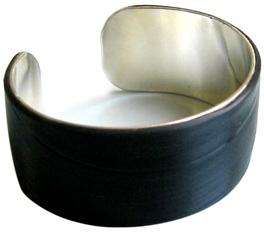 This sleek item is made from vinyl record scraps, which are carefully cut to size and bonded to a rhodium*-plated brass bracelet cuff. You can feel the grooves and tracks in the high sheen of the the vinyl, and that is a great feeling.