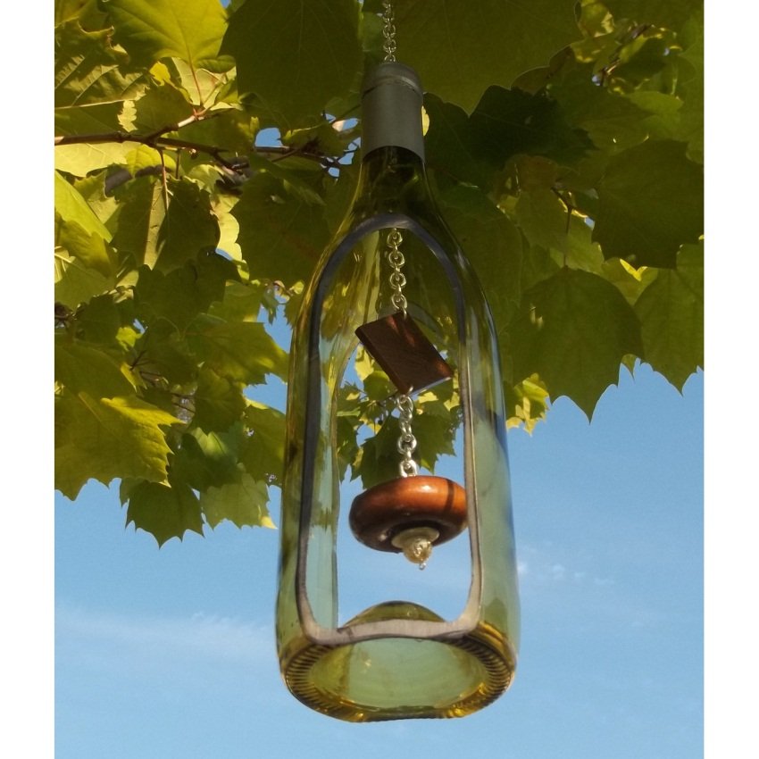 These wonderfully-designed wind chimes are made from a filleted wine bottle, cut twice and polished smooth. Each is built with a silver colored brass chain and a wooden knocker.