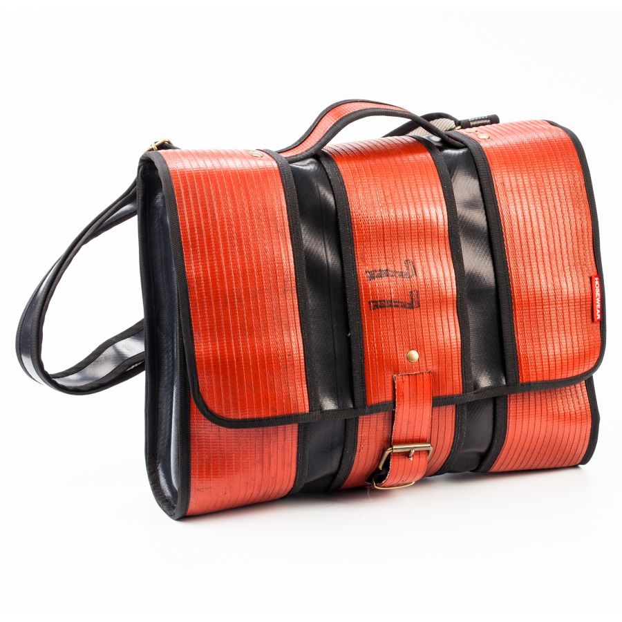 This fantastic accessory is made of two different kind of upcycled fire hoses. The course exterior of a red hose and the smooth interior of a black hose. The shoulder strap, also made from hose, is adjustable.