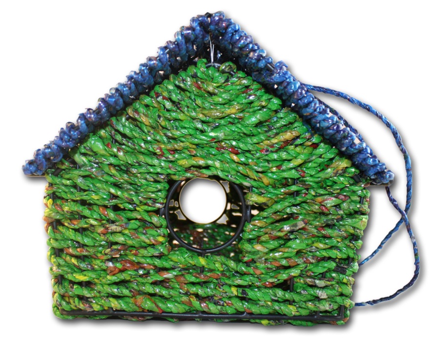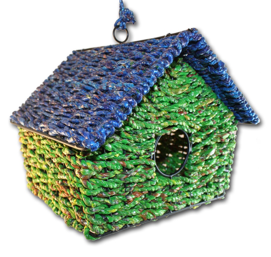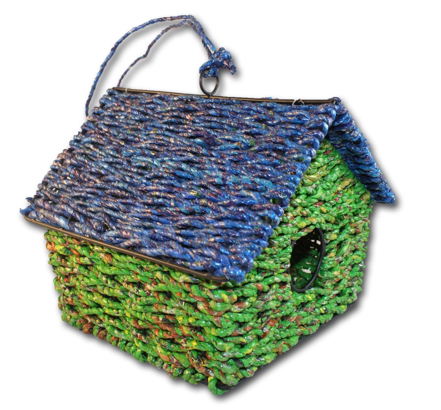 Add one of these next to a Round Wrapper Bird House for a well-rounded backyard birdie getaway! Made from reclaimed plastic wrappers that otherwise would have ended up in a landfill, they have been carefully woven together to make a whimisical bird house.