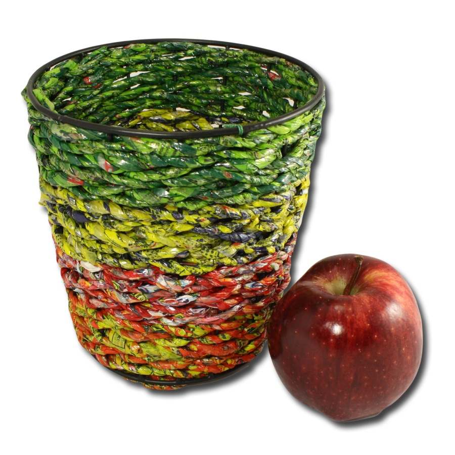Get ready to plant with this neat-o planter! Upcycled wrappers are carefully woven around a metal frame to provide you with the most colorful planter on the block! Exact patterns and colors may vary based on the availability of source material, but the size is exact.