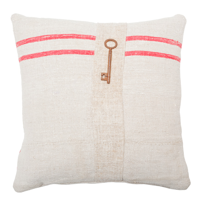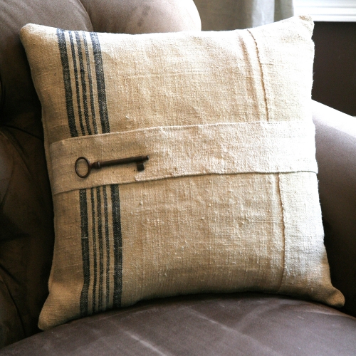 This lovely throw pillow is made from an upcycled Hungarian grain sack. A found, turn of the century skeleton key provides the finishing touch on these upcycled throw pillows, which are available in two colors. Please note that since these are made from whatever grain sacks are available, patterns and exact shades may vary slightly.