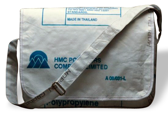 We think these messenger bags are just what you need to tote around your textbooks or netbook in upcycled style. Made by hand from excess polypropylene shipping material in Thailand, these are stronger than your average bag! If you prefer to carry your bag like a briefcase, the handle can be set close to the top of the bag to keep the straps from dragging on the ground. For a more traditional messenger bag feel, just adjust the 55 inch strap to a comfortable shoulder fit.