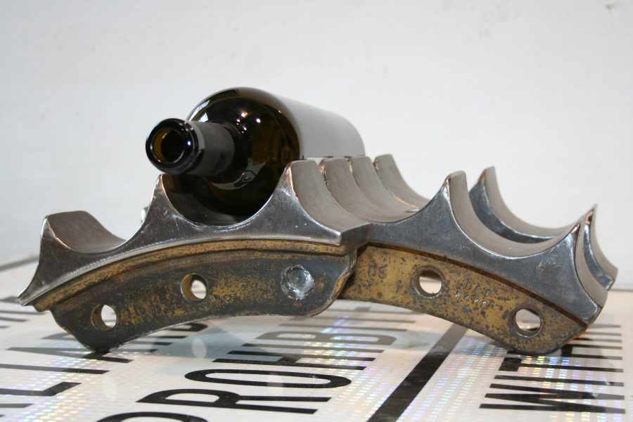 From the depths of monstrous mighty machines come these not-so-intimitidating wine racks. Just as car parts wear out, so do bulldozer parts, which are also sent to junk yards or even the dump. Rescued from an eternity in such unfortunate destinations, the bulldozer sprocket that makes up this product has bulled its last doze, and is now ready for the luxurious task of cradling your favorite wines!