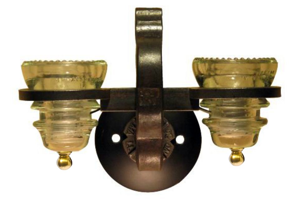 Without glass insulators, it is questionable whether the industrial revolution would have been possible. A frequently overlooked part of this crucial period of time, insulators were used with telegraph lines, telephone lines, and electric power lines. Today's telecommunication industry would undoubtedly not be the same if these had never been invented. These were produced by the millions until the 1970s, when modern technology deemed them useless. Now considered collectible items, they are again found useful in this sconce light.