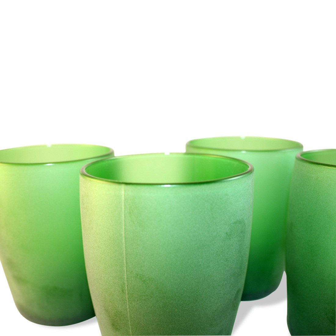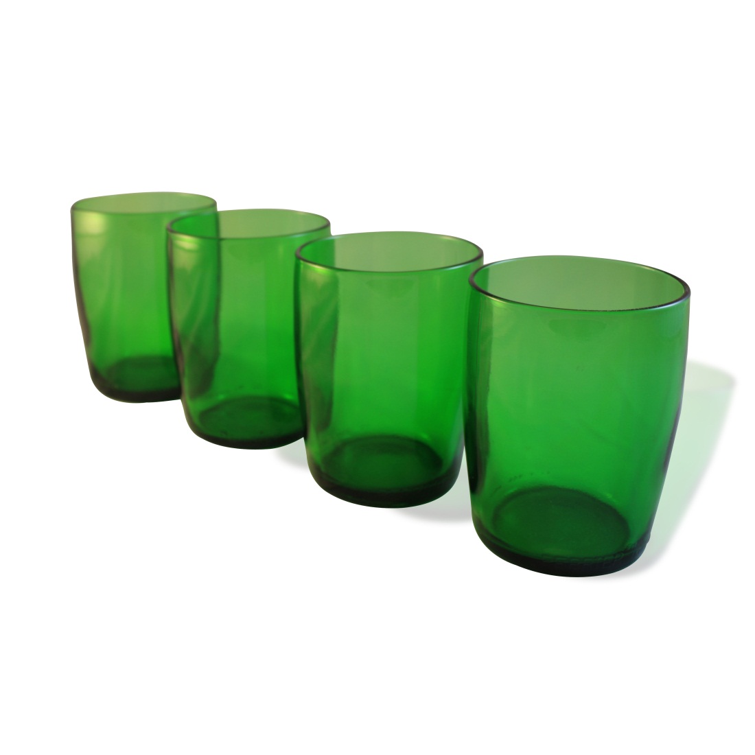 These glasses are simply stunning. They have beautiful curves evocative of their source - 750mL glass Perrier bottles - and rich green color that makes you look twice. Sturdy enough to use every day, but since they are made from drink bottles, they are fully recyclable if they should ever break.