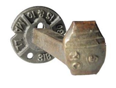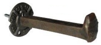 Railroad spike door stop is made with reclaimed, repurposed hardened railroad steel parts and comes with a 2" diameter decorative cast iron washer and a 2” threaded wood screw.
