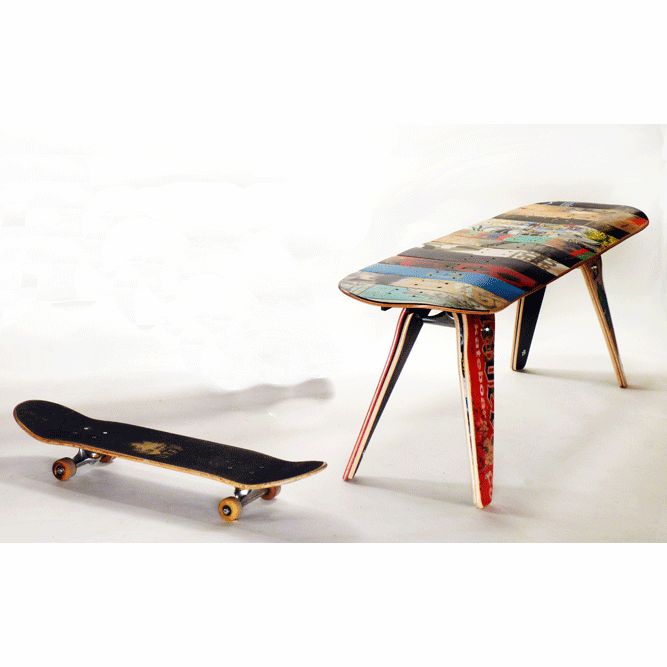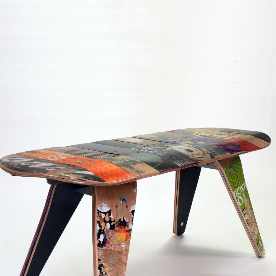 As you may know, skateboards get beat to heck, and broken decks (the wooden top part) are all too common. Unless they are rescued for cool items like these benches, where do they usually go? You got it: the landfill.