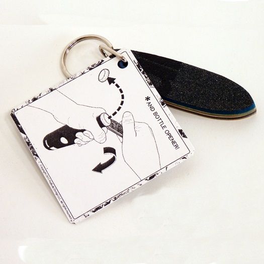 These key chains are made from real skateboards that got broken, so every one is uniquely awesome. The reverse side features the original grip tape.