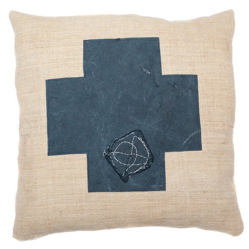 This lovely throw pillow, inspired by Switzerland's flag, is made from an upcycled Hungarian grain sack. Wondering what the blue portion is made from? An old truck tarp, of course!