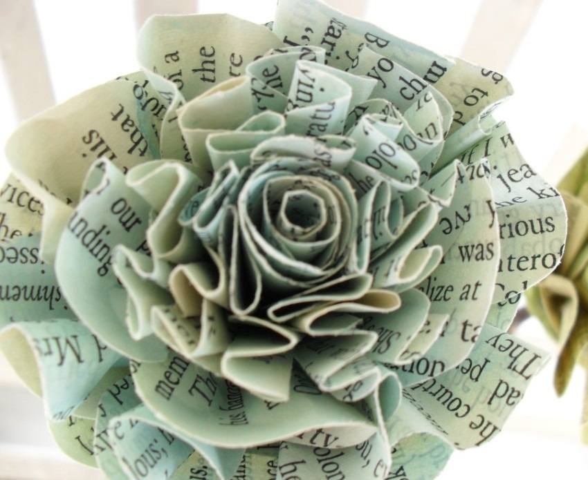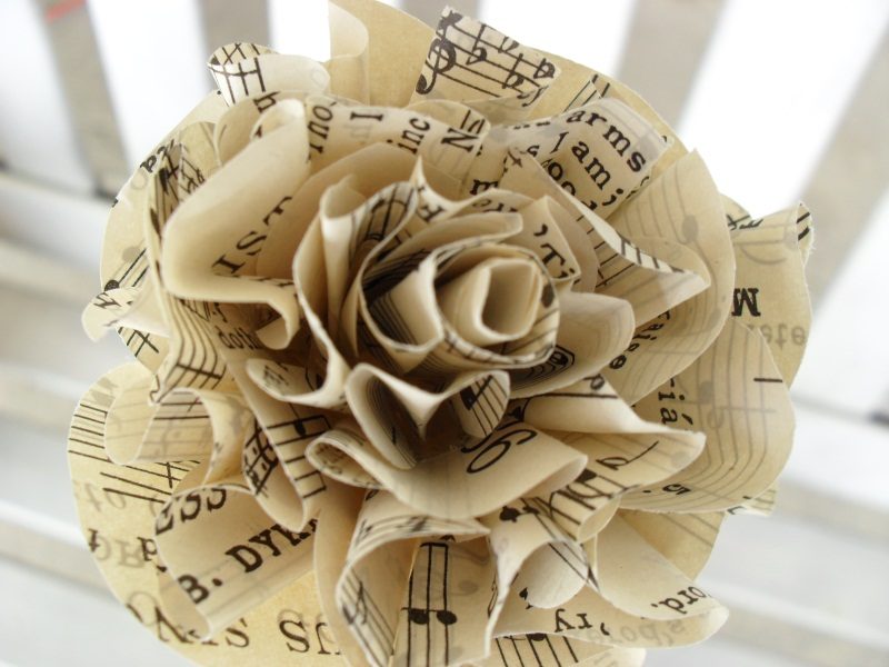 Rescued books lend their text to your choice of colored flowers, or opt for the plain look of antique book paper. Alternately, make your heart sing with plain sheet music flowers that are especially perfect for your favorite music lover.