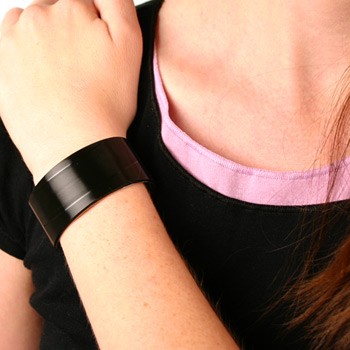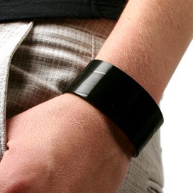 This sleek item is made from vinyl record scraps, which are carefully cut to size and bonded to a rhodium*-plated brass bracelet cuff. You can feel the grooves and tracks in the high sheen of the the vinyl, and that is a great feeling.